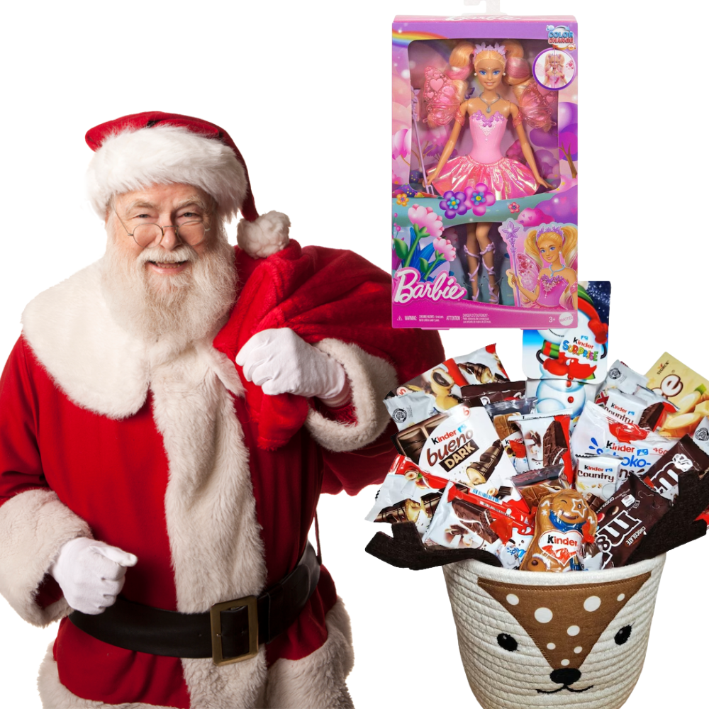 Pachetul include livrarea realizată de Moș Crăciun în costumație specifică, o păpușă de jucărie Barbie pentru fetiță și un coș cu dulciuri dedicate copiilor.