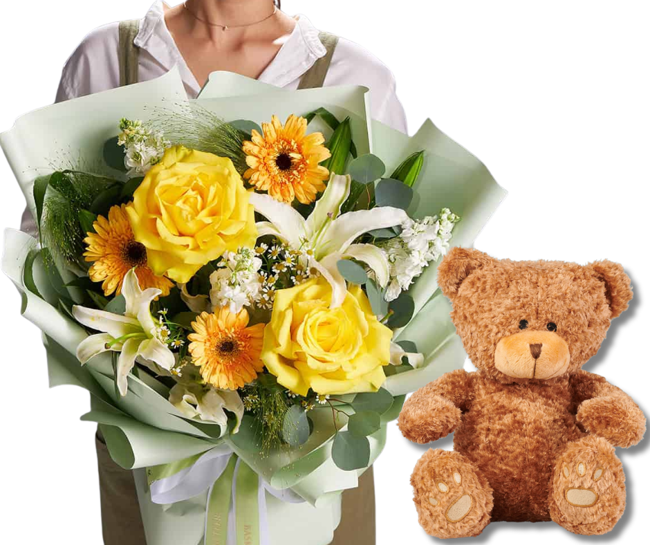 Surpriză la Domiciliu cu Ursuleț și Buchet Galben”